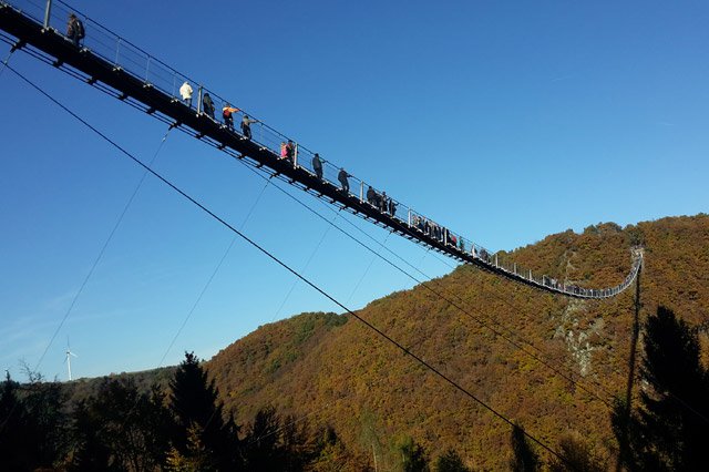Auf der längsten Hängeseilbrücke Deutschlands im Hunsrück 360 m lang und 100 m über dem Grund.